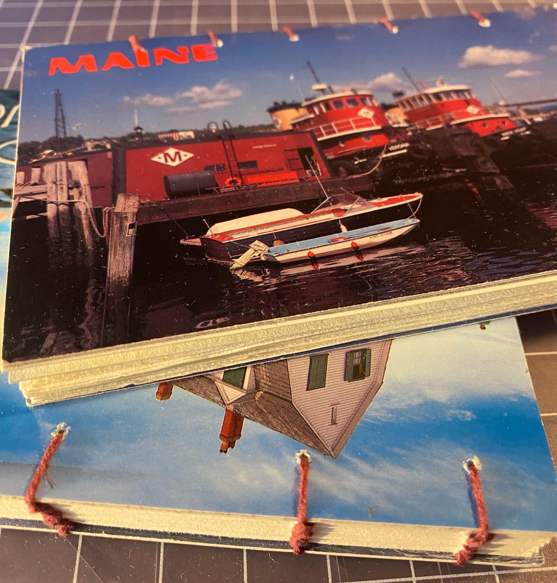 Postcards or Kerner Marbled paper over boards as the cover, and interior sheets of Mohawk Superfine.